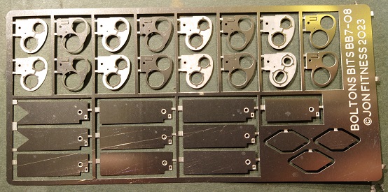 | BB7-01 Etched nickel silver bolting plates for LMS tubular post fittings. Used opposite almost anything bolted through the posts. Will require forming to match post diameter. £1.50 INSTRUCTIONS NOT YET PREPARED |
